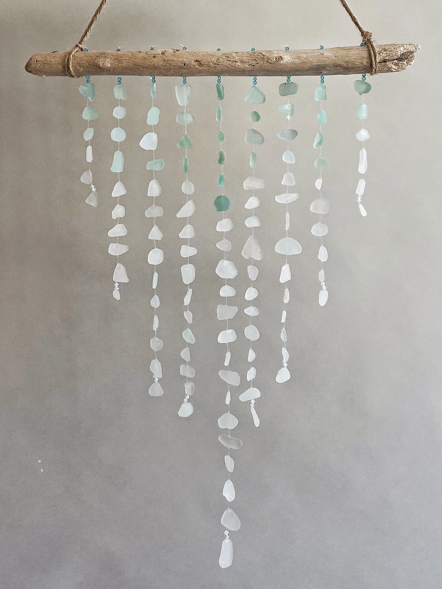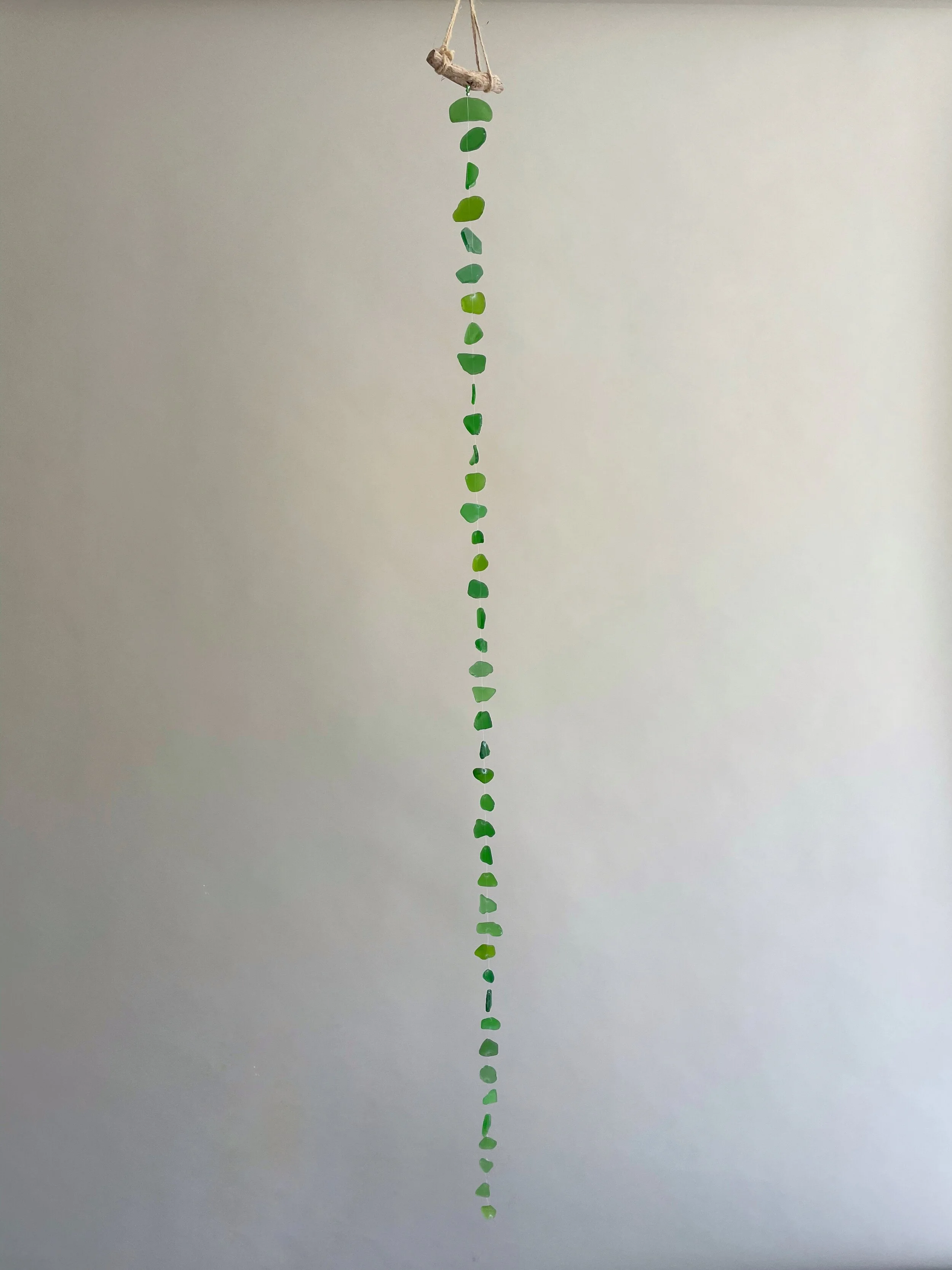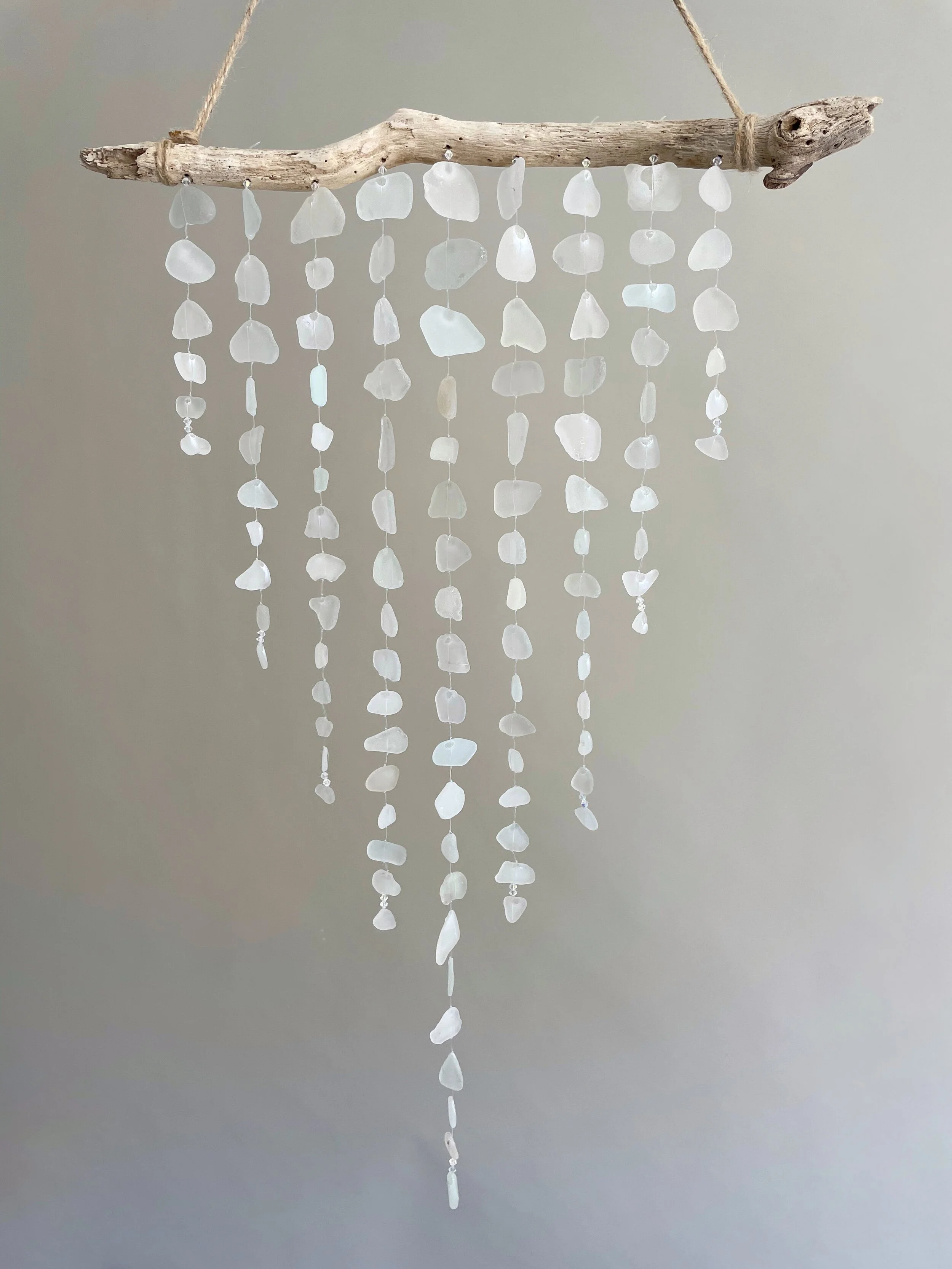In a celebration of light and movement, this collection of sea glass and driftwood mobiles mimics powerful Hawaiian elements—cascading waterfalls, unfurling fern fronds, and bubbling sea foam—in a delicate form.